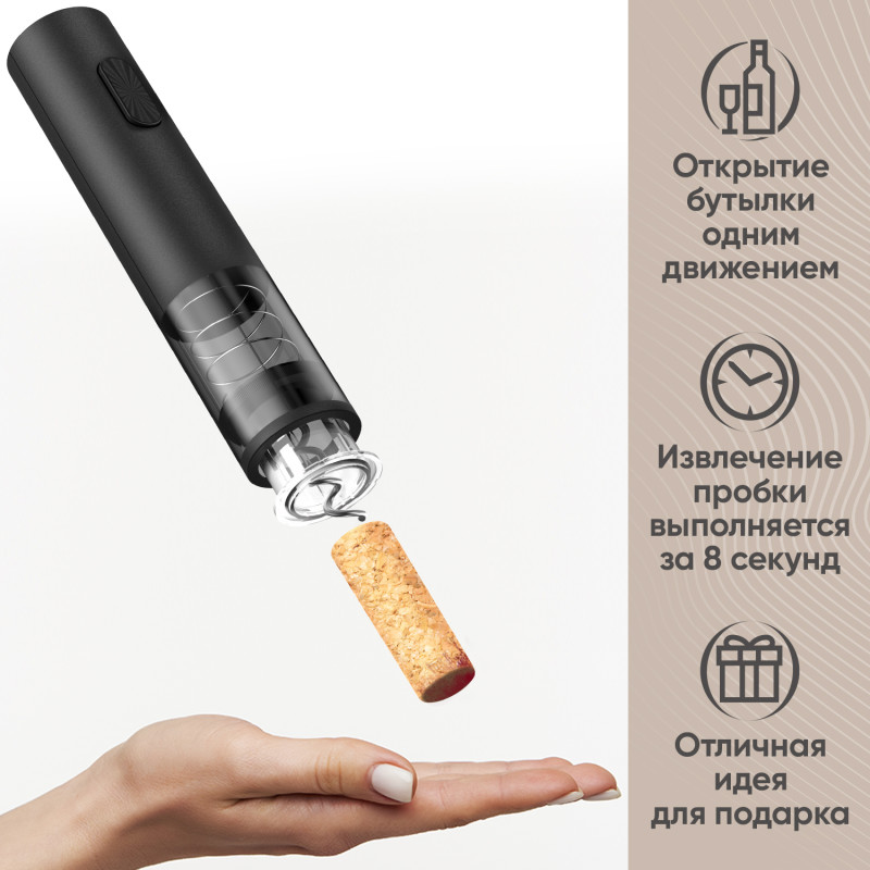 • Электрический винный штопор: Легко и быстро открывает бутылки вина одним нажатием кнопки. Подходит для всех стандартных винных бутылок.